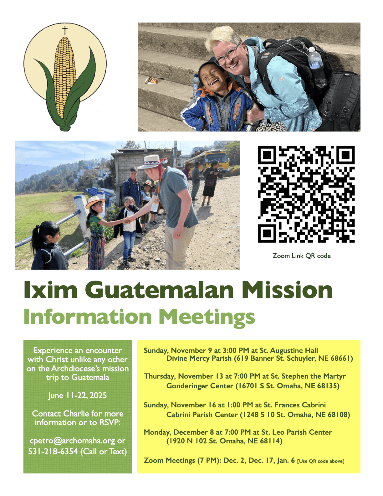 Our information sessions for our twenty-first core mission trip are scheduled. Come to one of these meetings or join us on Zoom for one hour of the How and Why of Ixim's mission. Start discerning your call to join us on mission this coming June 11-June 22. We're looking forward to seeing you there. Email Charlie (cpetro@archomaha.org) to RSVP or for the Zoom link.